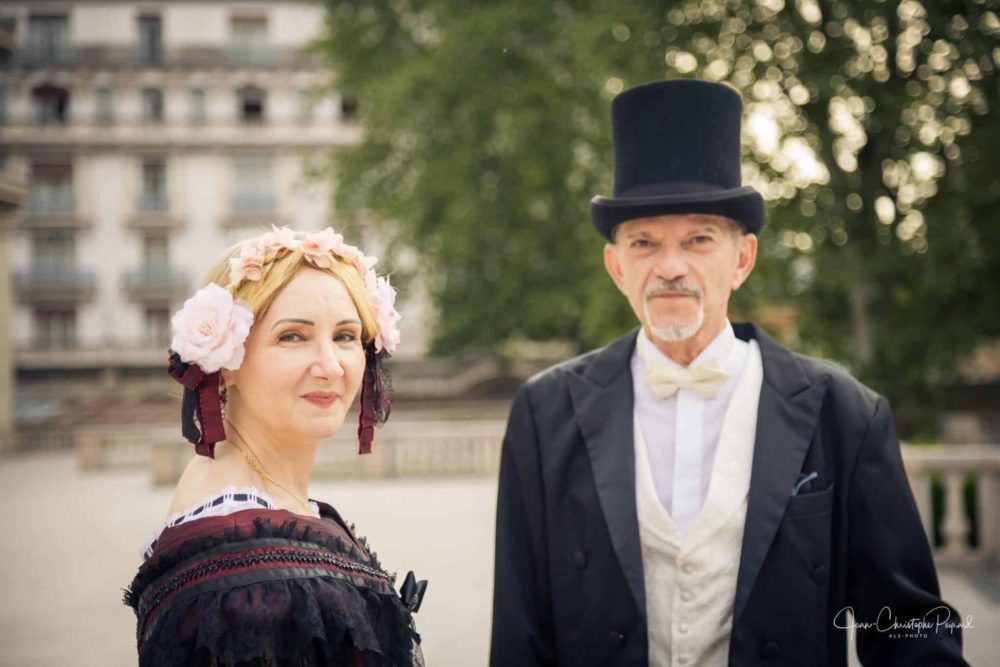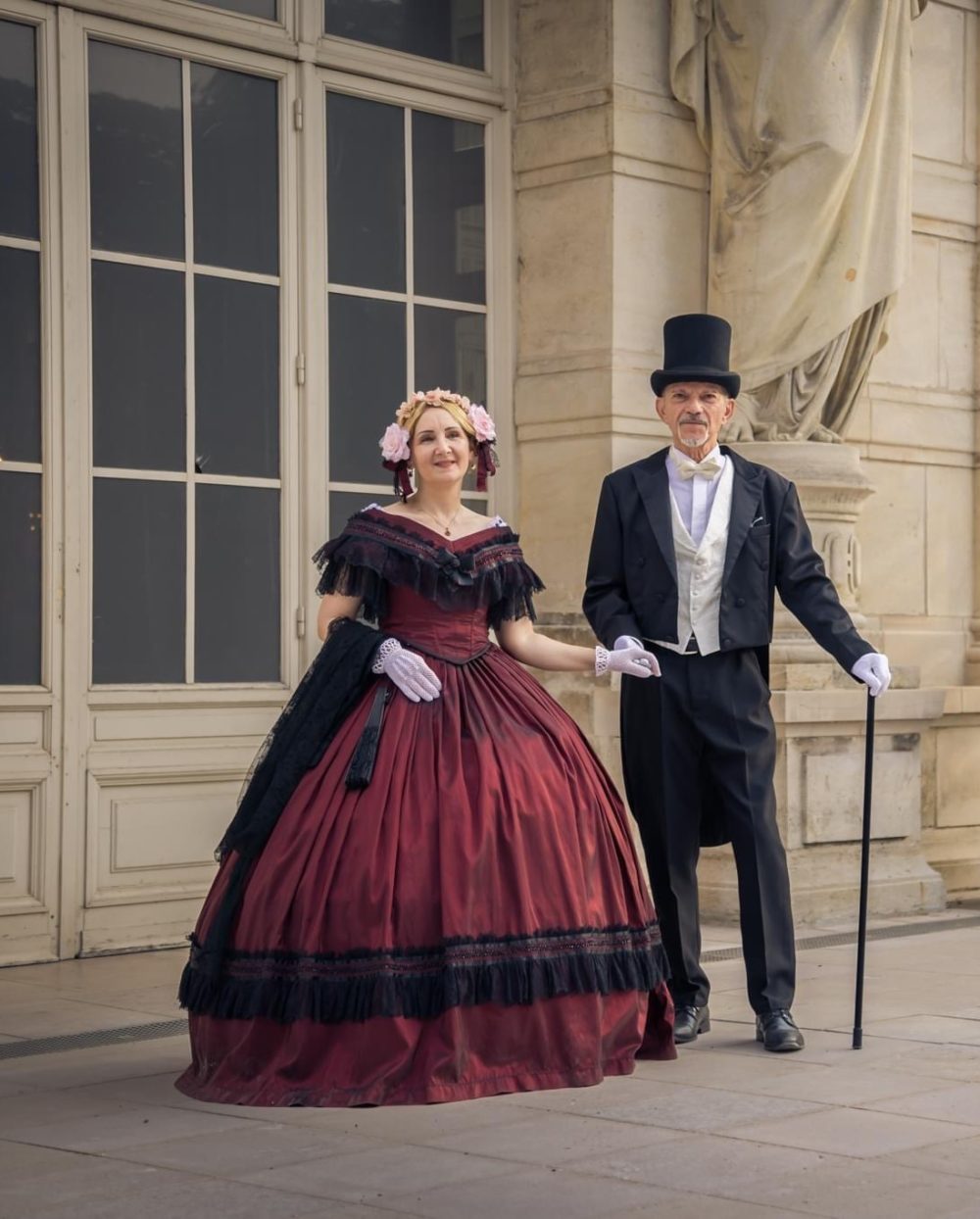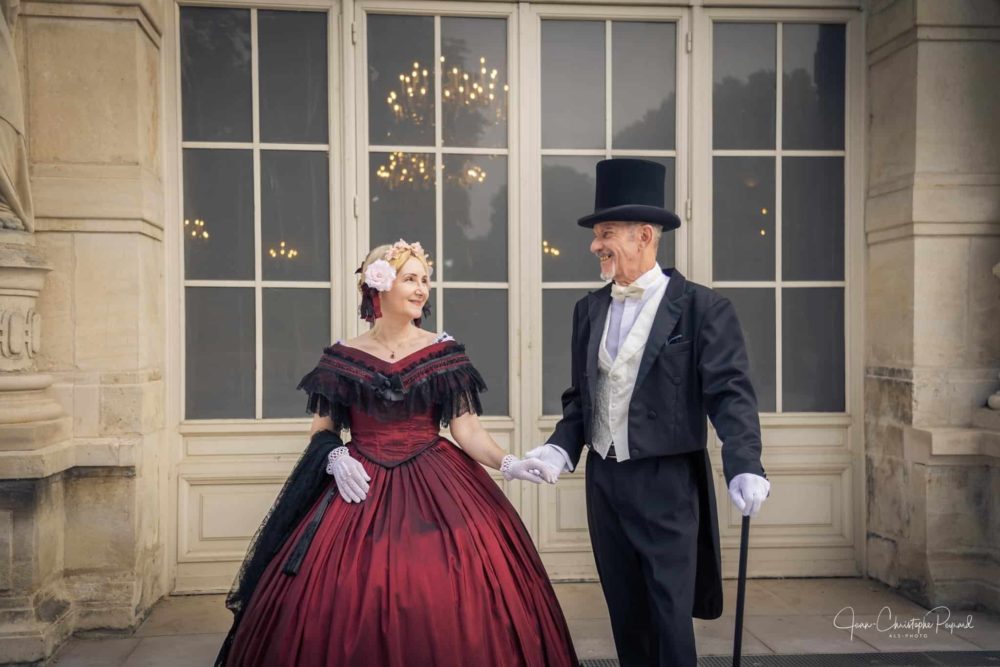 Robe de Bal en taffetas de soie bordeaux, dentelle de Chantilly et galon de perles de Jais